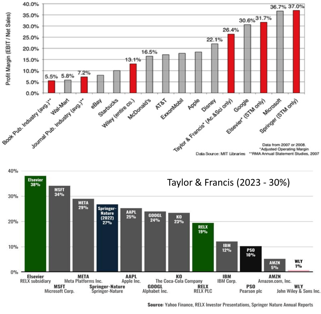 Figure 1: profit margin of few major companies (in grey) compared to major publishers (colored) in 2007 (above and 2023 (below). The profit margin of Taylor & Francis is reported as text in 2023. Sources are reported in the figure (9, 10).